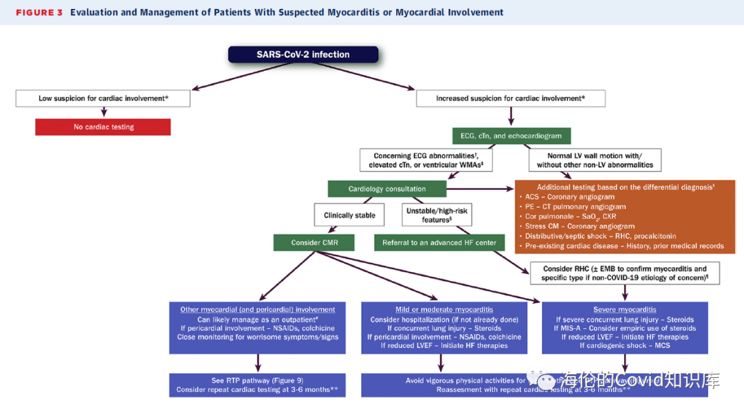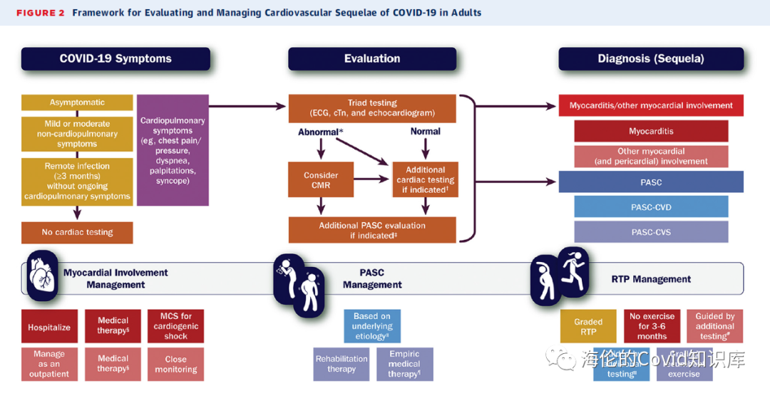 流程参见下图:症状评估、实验室及影像学评估,诊断,最后对三种临床情况进行管理(心肌炎、新冠后遗症相关心脏症状、新冠患者恢复运动)