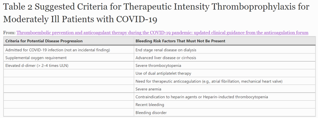 建议(suggest)临床医生考虑使用治疗强度 LMWH 或 UFH 血栓预防非危重患者疾病进展或血栓栓塞风险增加,并且抗凝相关出血风险不高(表2)