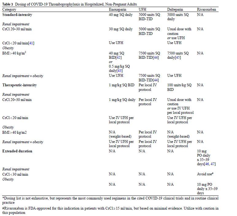建议居住在长期护理环境中的患者,如果新冠足够严重,可以考虑入院,但仍然留在长期护理机构,只有在符合护理目标的情况下,才可以提供长达10-14天的标准强度血栓预防(表3)。